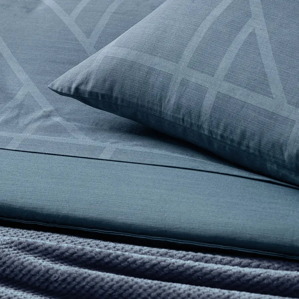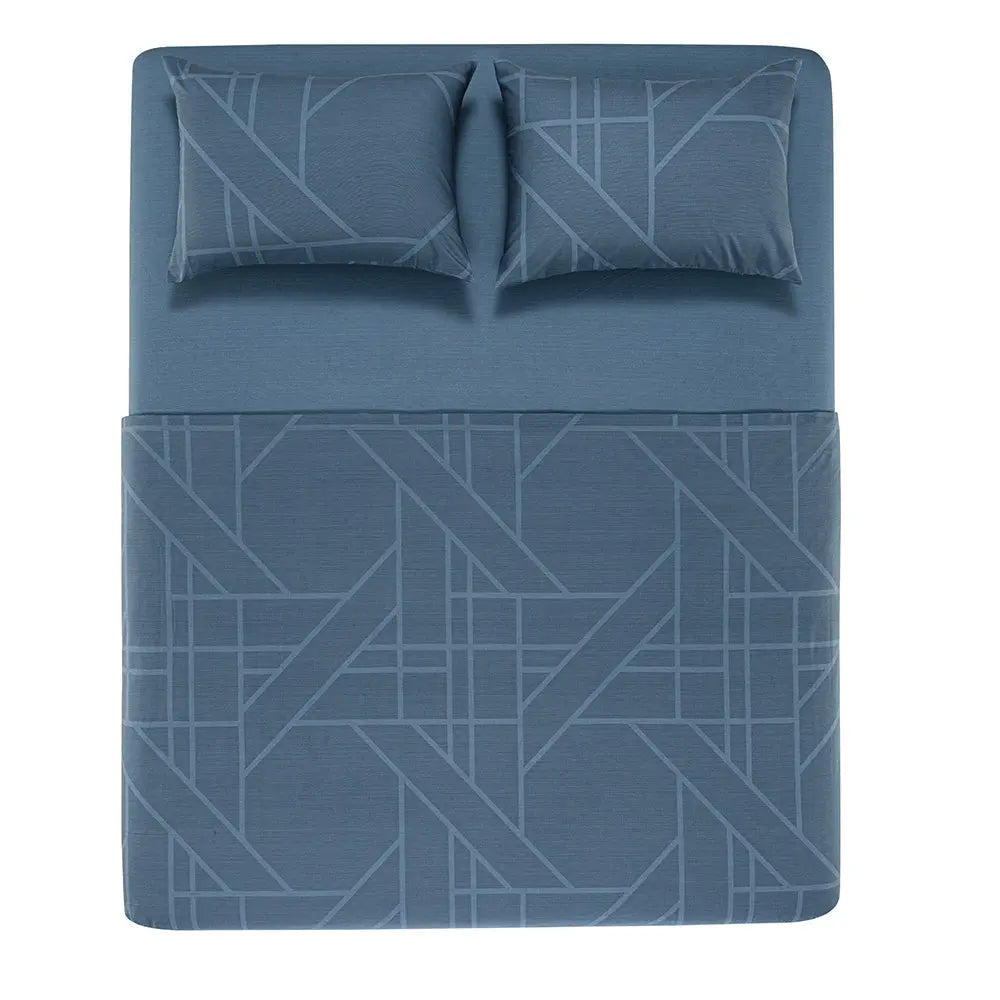O Jogo de Cama Isac tem estilo moderno e minimalista que combina com os mais variados gostos, com um azul lindo e desenhos geométricos.