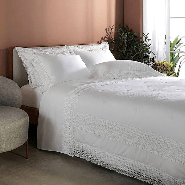 A coleção Margiela II apresenta através de uma moderna e elegante releitura os clássicos jogos de cama. Emoldurado por deslumbrante bordado em guipure em formas geométricas, destaca um visual chique e dinâmico. Confeccionado em puro algodão fio penteado e cetim 400 fios, oferece toque macio e suave, com acabamento primoroso. As fronhas dispõem de abas nos três lados e o lençol de baixo, possui elástico, modelo que se destaca por otimizar o tempo no momento da troca. Com detalhes impecáveis e tonalidade neutra permite que diversas composições sejam criadas, utilizando itens variados de Buddemeyer Luxus.